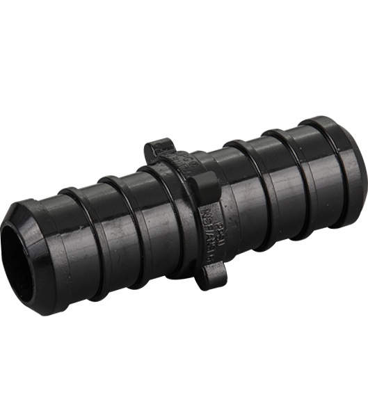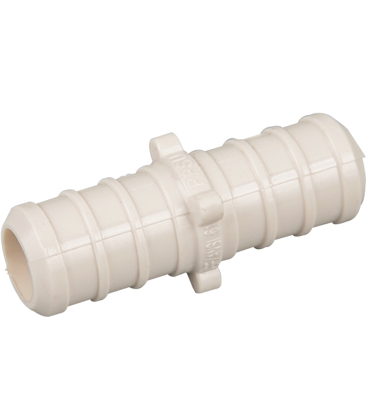 Equal crimp style coupling connects two 1/2" PEX pipes together.