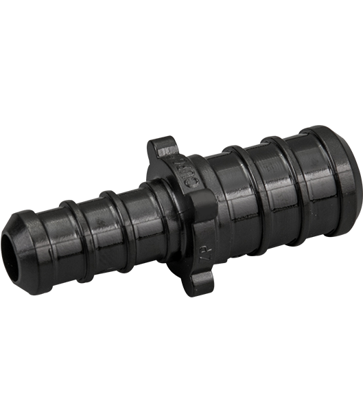 This Poly alloy PEX crimp style reducing coupling connects 1/2"to 3/8" PEX tubing together.
