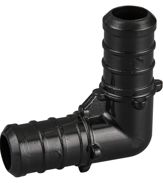 1/2" Poly PEX elbow connects two 1/2" PEX pipes at a 90-degree.
