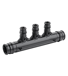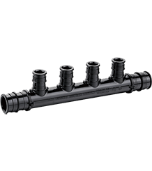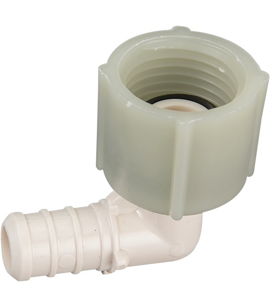 This poly PEX elbow has a female threaded swivel connection (with rubber washer) and allows to connect 1/2" PEX pipe to 1/2" male threaded pipe or outlet at a 90-degree angle.