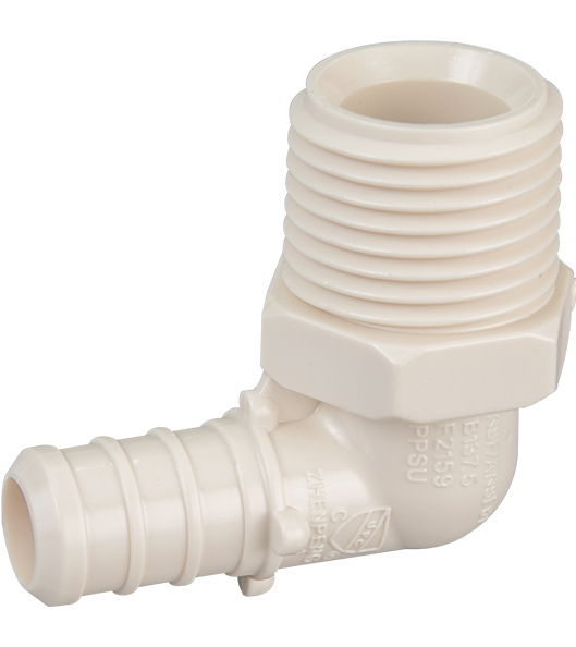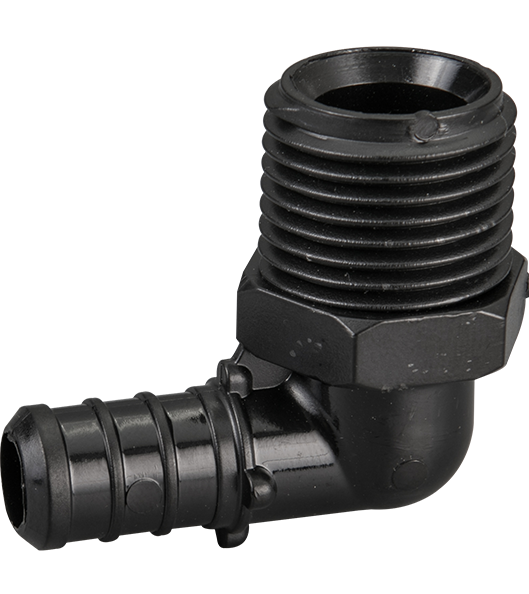 This 90-degree poly PEX elbow allows to connect 1/2" PEX pipe to a 1/2" female NPT threaded outlet or fitting.