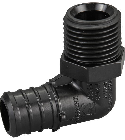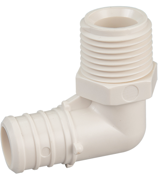 This 90-degree poly PEX elbow allows to connect 3/4" PEX pipe to a 1/2" female NPT threaded outlet or fitting.