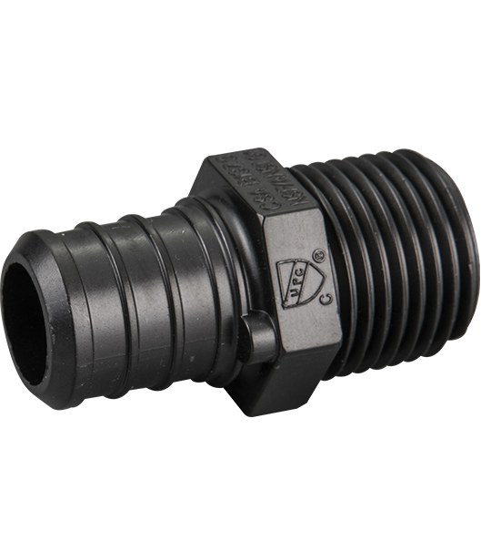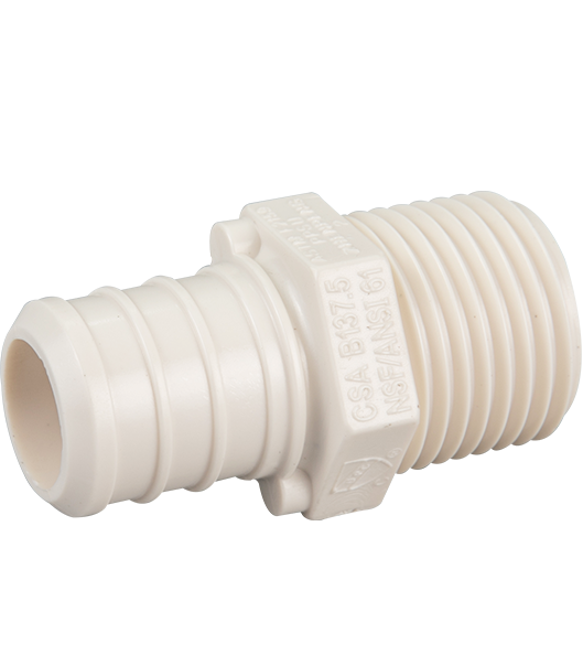 Reducing style PEX MPT adapter connects 3/4" PEX to 1/2" threaded connection.