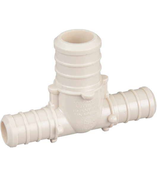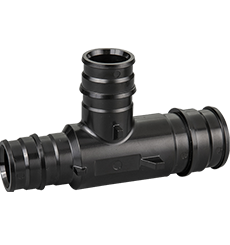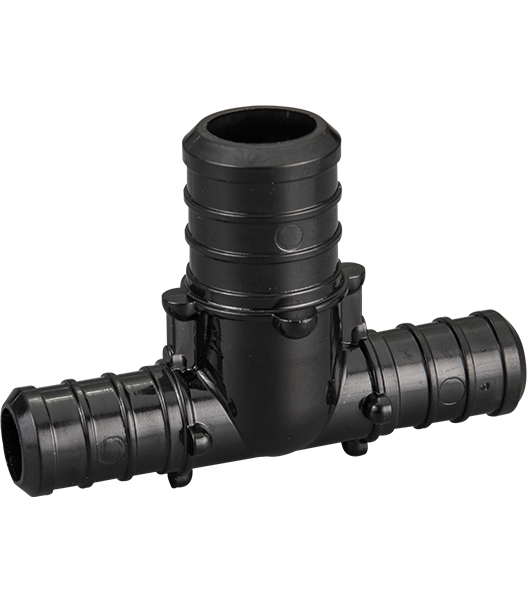 This reducing style PEX tee with 1/2" straight-through channel and 3/4" PEX branch in the middle.