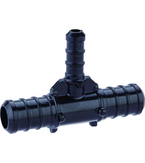This reducing style PEX tee with 1/2" straight-through channel and 1/4" PEX branch in the middle.