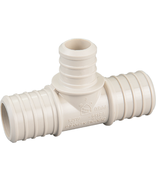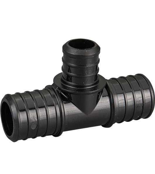 Reducing style PEX tee with 1" straight-through channel and 3/4" PEX branch in the middle.