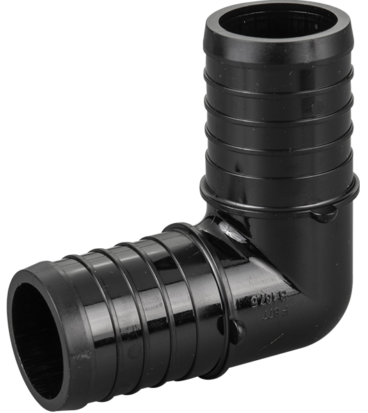 Large diameter poly alloy PEX elbow connects two 1-1/4" PEX pipes at a 90-degree.