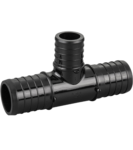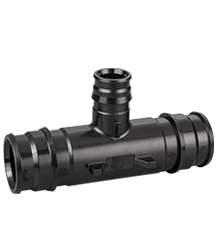 This reducing style large diameter PEX tee with 1-1/4" straight-through channel and 1" PEX branch in the middle.
