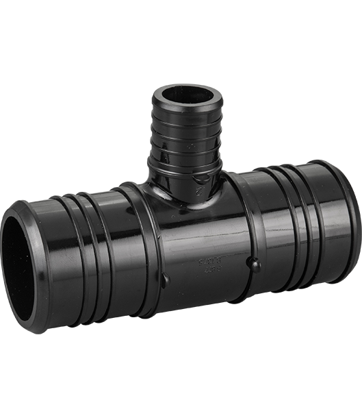 This reducing style large diameter PEX tee with 2" straight-through channel and 1" PEX branch in the middle.