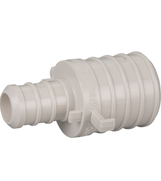 This reducing style PEX poly coupling connects 1" PEX to 1/2" PEX piping.