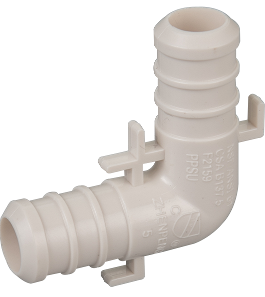 This 1/2" Poly crimp stop PEX elbow connects two 1/2" PEX pipes at a 90-degree.