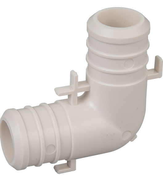 3/4" Poly crimp stop PEX elbow connects two 3/4" PEX pipes at a 90-degree.