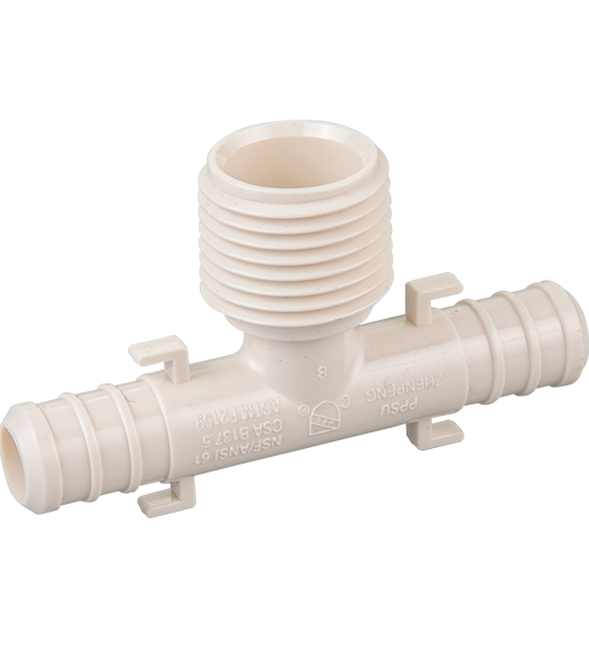 This reducing style PEX tee with 1/2" crimp straight-through channel and 3/4" NPT branch in the middle.