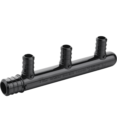 Expansion style 2 port poly alloy PEX plumbing manifold, 3/4 inch PEX inlet,(2)1/2 inch ports,closed,Lead-Free.Installed using expansion method (expander tool + expansion rings).