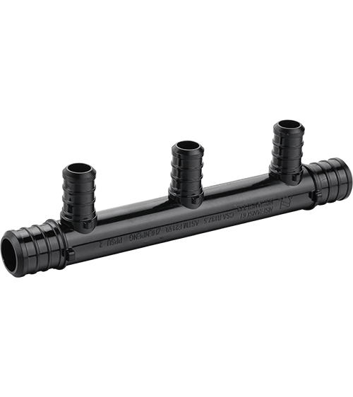 3/4 inch PEX inlets and 1/2 inch PEX outlets, two ends open, 3 outlets, PEX-B connectors, F2159